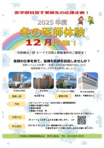 2025.11.25[火] 高校生・受験生向け 2025年 冬の医師体験 2025年 冬の医師体験開催のご案内!みなさん、こんにちは。冬の一日医師体験の受付を開始いたします。冬休みの貴重な1日で医師体験をしてみませんか?参加費は無料です。皆様のご参加をお待ちしています。今回… > 続きを読む 2025.11.11[火] 高校生・受験生向け 医師講演 「私が医師を目指したきっかけ」 > 続きを読む 2025.11.11[火] 高校生・受験生向け 医学生とのしゃべり場 > 続きを読む 2025.09.26[金] 高校生・受験生向け 模擬面接会のご案内 2025年11月 > 続きを読む 2025.08.18[月] 高校生・受験生向け 現役医師による医療倫理セミナー > 続きを読む 新着ニュース一覧を見る