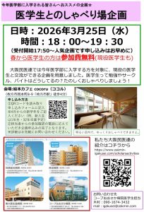 2026.02.12[木] 2026年 新歓企画 医学生とのしゃべり場 今年、医学部へ入学される方を対象に医学生とのしゃべり場を計画しました。医学生って、勉強・サークル(部活)・バイトなどどうしているのか?楽しくおしゃべりをしましょう!下記、URLよりお申し込み下さい。https://www.oskmin-igakusei.com/inquiry-event-medical-st… > 続きを読む 2026.01.24[土] 2026年2月 模擬面接会のお知らせ > 続きを読む 2025.11.25[火] 高校生・受験生向け 2025年 冬の医師体験 > 続きを読む 2025.11.11[火] 高校生・受験生向け 医師講演 「私が医師を目指したきっかけ」 > 続きを読む 2025.11.11[火] 高校生・受験生向け 医学生とのしゃべり場 > 続きを読む 新着ニュース一覧を見る